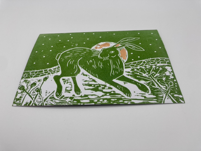 Handprinted and hand finished Lino cut card with envelope. Cards may vary in colour and print due to the printing process.